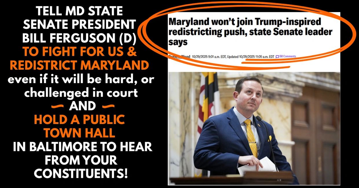 Maryland State Senate President Bill Ferguson (D-Bmore City) has come out against even TRYING to fight for Marylanders & all Americans by redistricting Maryland's Congressional map in the face of unprecedented efforts by the U.S. President to directly interfere and push to rigg election maps in states all over the U.S. in an effort to give Congressional Republicans a huge advantage in the 2026 Midterms allowing them to further erode our freedoms and the institutions that have supported democracy for nearly 250 years.